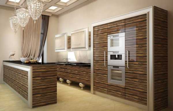 Функциональную зону украшают шкафы под потолок с фасадами из натуральной древесины. Особый шик — мебель из дуба, красного дерева, массива черного ореха и ольхи. Из натуральной древесины получают гарнитуры с фасадами цвета венге, переходящего в черный густой тон. В современных интерпретациях вместо дорого дерева используют крашеные эмалевые рамочные фасады из МДФ со шпоном под лаком.