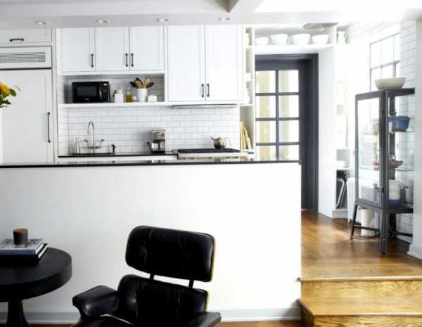 Еще один вариант open-space – создание полуостровной кухни, называемой в быту «архипелагом». Мебель зонирует периметр и расширяет функциональную зону. В этом случае мойка с вытяжкой находится на небольшом удалении от стены. На скромной по метражу кухне в центре устанавливают узкую барную стойку, под обеденный стол используют переоборудованный подоконник. Стойка может быть сквозной или оснащена открытыми полками или ящиками для хранения утвари. Для оптического увеличения комнаты напротив вешают зеркало в раме.