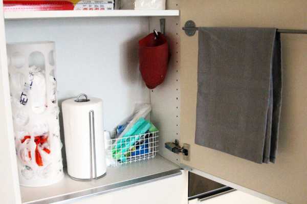 Выше я сделала довольно высокий отсек, где у меня в разных корзиночках хранятся пакетики, рулонные тряпочки, на дверце — тот же рейлинг Бюгель для полотенца. удобно, оно спрятано, но всегда под рукой. На крючке висят прихватки-варежки