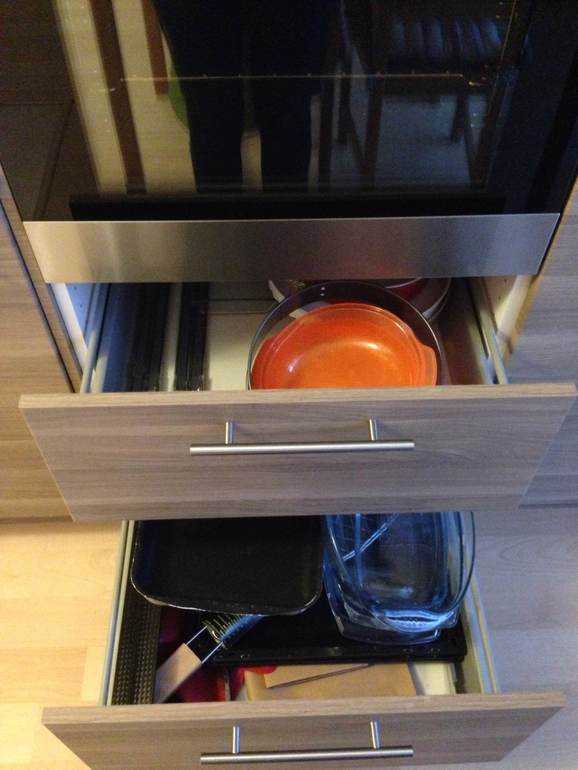 В нижнем шкафу под духовкой — хлебопечка и мультиварка, они там на ПМЖ, так как к ним специально выведена розетка в задней стенке шкафа. во время работы я просто выдвигаю ящик, а потом закрываю его. и место на столешнице не занимается громоздкими приборами.
