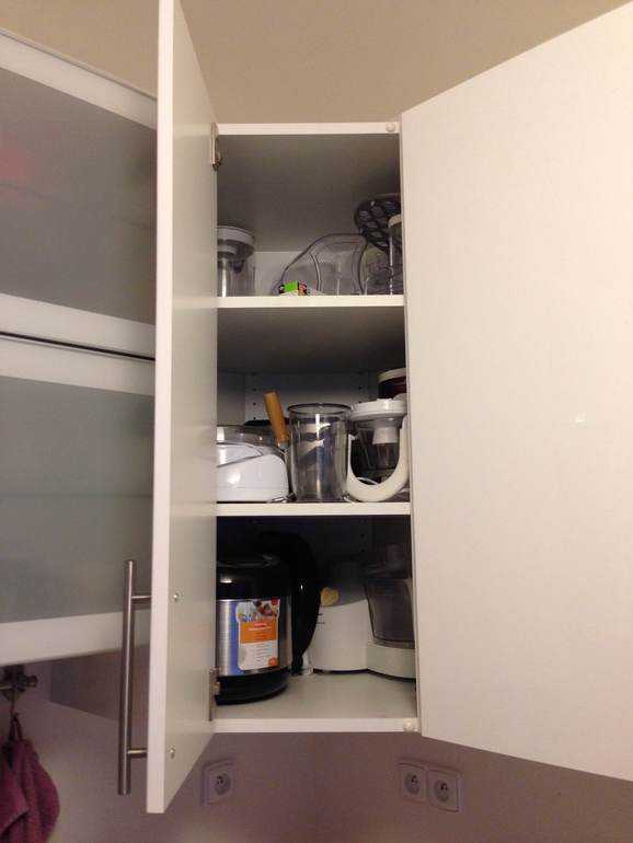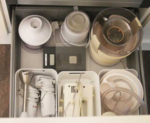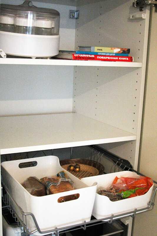 внизу — мелкие бытовые приборы. мне очень удобно использовать для организации пространства икеевские контейнеры для ящиков