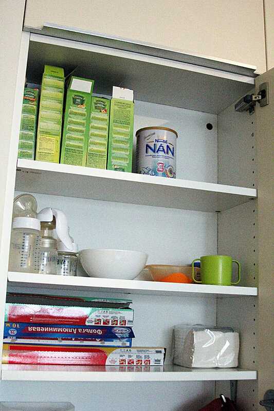 Еще выше — детские полки и узкий отсек для рулонов и салфеток