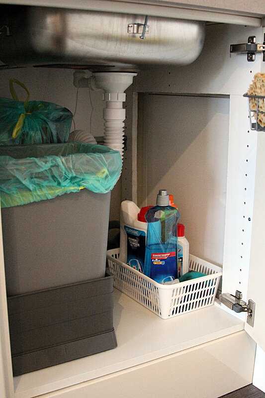 Дальше шкаф под мойкой. Там у меня икеевская выезжающая штука с двумя ведрами (мы не занимаемся сортировкой, но все равно очень удобно, т.к. не всегда есть возможность сразу вынести наполненное ведро, у нас новостройка и мусоропроводы временно замурованы от таджиков). также там живет корзиночка с чистящими средствами и порошками-ополаскивателями для ПММ. в боку выпилена дырка, чтобы открыть доступ к люку стояка водопровода. там же за дверкой спрятался водяной фильтр и счетчики на воду. тряпочки-щеточки, и средство для мытья посуды в быстром доступе в корзинке, привинченной к фасаду шкафа (это тоже икеевская корзиночка Бюгель). Кажется, осталось даже место для измельчителя, все мечтаю его тоже установить