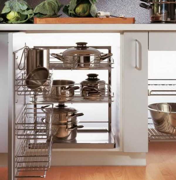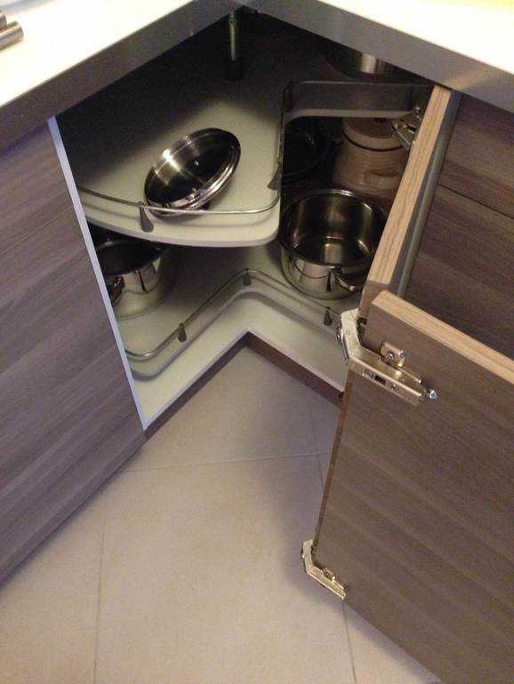 Устройства типа выдвижных и карусельных полок, систем с разворачивающимися контейнерами и т.п. позволяют рационально использовать пространство нижних угловых шкафов.
