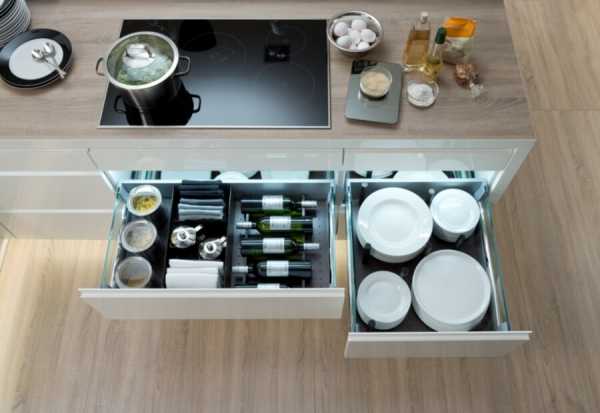 5 Обустройте пространство под столешницей. Прямо под столешницей можно расположить системы хранения столовых приборов и аксессуаров, удобно организованные за счет вкладышей в ящики (под различную их ширину от 300 мм до 1200 мм) с разделителями, гнездами (для ножей, венчиков, терок и пр) и съемными лотками-контейнерами. Если глубина позволяет, можно использовать вставки типа «второе дно», те же поперечные рейлинги и разделители для организации пространства. В такой ящик можно встроить разделочную доску или, например, электронные весы или пару дополнительных розеток.