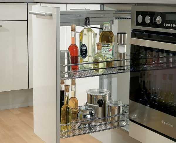 2. Выдвижные корзины очень удобны, особенно на для маленькой кухни. Они позволяют использовать всю глубину шкафа даже при его небольшой ширине, так как они легко выкатываются даже при тяжелом содержимом благодаря прочным направляющим. Такая корзина скользит бесшумно и позволяет видеть и брать все содержимое с любой стороны. Задвигается легким толчком. Выдвижные корзины бывают узкими и объемными, специальными, например для хранения чистящих средств под мойкой. Бутылочницы – это тоже выдвижные корзины.