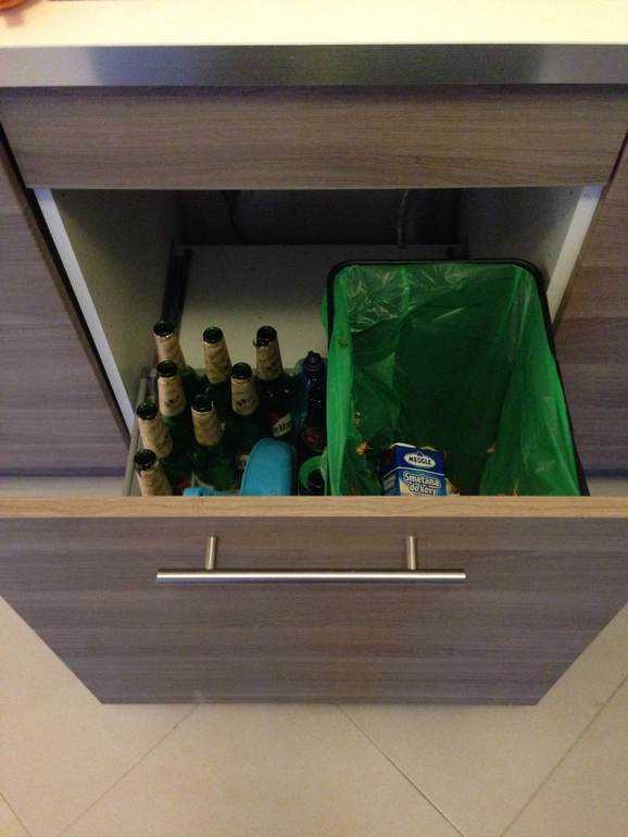 4. Кухонное ведро в настоящее время имеет различные варианты: оно может крепиться на дверку или представлять собой набор емкостей в специальном ящике для сортировки мусора и др. Можно даже сделать в столешнице отверстие, чтобы через него выбрасывать в ведро очистки во время приготовления пищи.