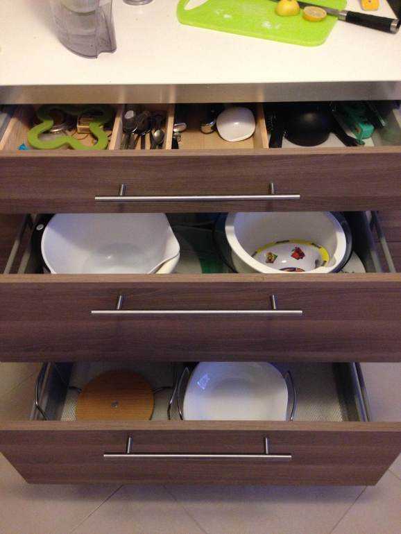 в верхних узких — всякие мелкие кухонные приблуды и вилки-ложки-ножи. Разделители, конечно, это вещь!