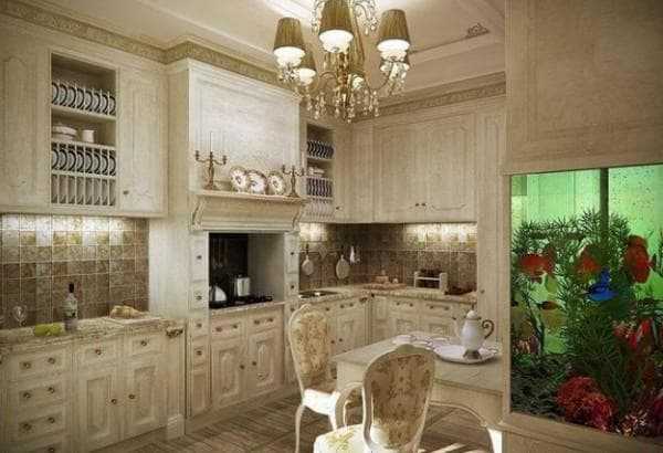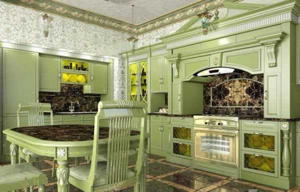 Классика. Какая классическая кухня без круглого обеденного стола? К тому же он отлично разграничит рабочую площадь и территорию, отведенную для душевных разговоров. Здесь уместен камин, книжные шкафы, мягкий ковер. Кухня выстраивается по одной стене.
