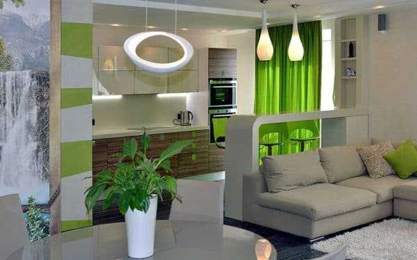 Зонирование применяется при объединении 2-х комнат. При совмещении кухни с гостиной без выделения зон не обойтись.