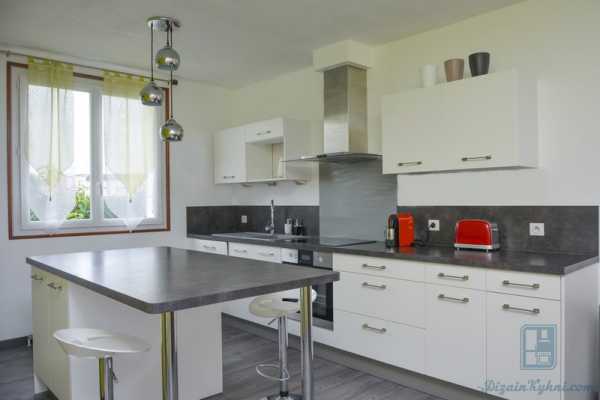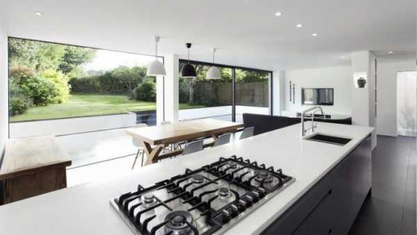 На белой кухне рекомендуем не перегружать интерьер слишком сложной формой кухонного острова. Лучше ограничится простым гарнитуром, а акцент сделать на оформление стен и декоративных элементах. В частном доме замените одну из перегородок на большое окно.