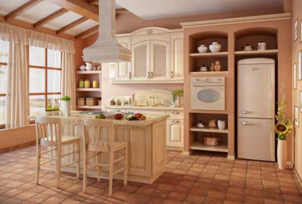 Фактически, французская классика. На полу та же плитка, на стенах светлые обои в легкомысленный цветочек, потолок покрыт штукатуркой. Мебель из дерева, но не добротно-грубоватая, как в английском стиле, а изящно-вычурная. Кованные спинки приветствуются, хорошо, если у стола будет стеклянная столешница. На окнах занавески из тюля, которые закрывают только половину окна, на столе обязательная ваза с цветами и лампа в симпатичном цветочном абажуре. Аксессуаров не слишком много, преимущественно мелочи для готовки. Основное ощущение — летнее радостное утро.