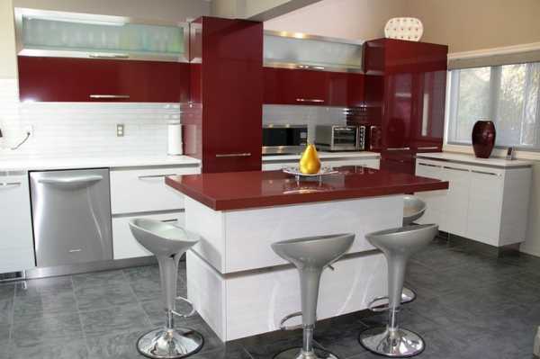 Ярко-малиновое глянцевое исполнение основания острова и белоснежная столешница в точности повторяют цветовое решение кухонного гарнитура. В сочетании с белой отделкой комнаты и ярким напольным покрытием кухня смотрится празднично, позитивно и привлекательно. В такой обстановке поднимается аппетит, настроение и позитивный настрой.