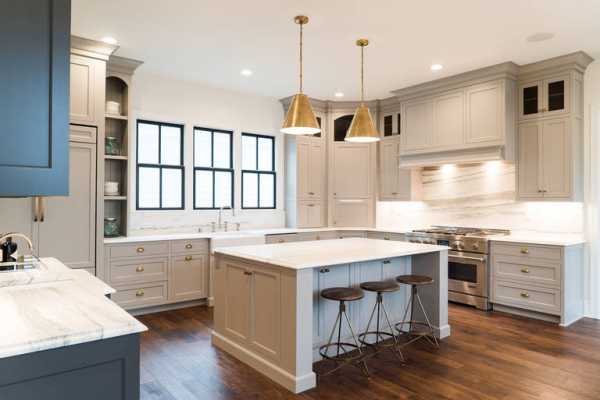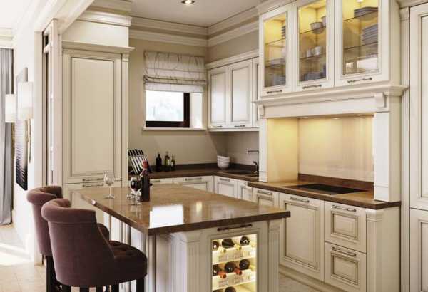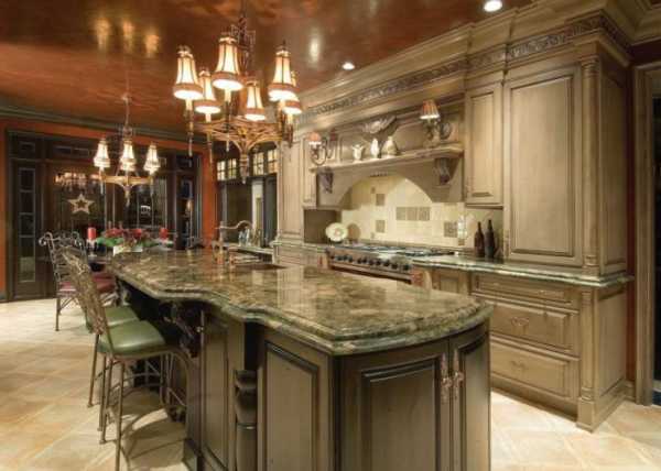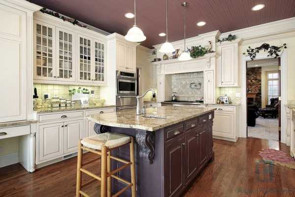 В интерьерах, оформленных в сдержанных традиционных мотивах, остров тоже уместен. Попробуйте сделать кухню в светлых тонах, с белыми фасадами и каменными столешницами. Изящная патина, элегантные детали смотрятся изумительно, особенно в таких масштабах.