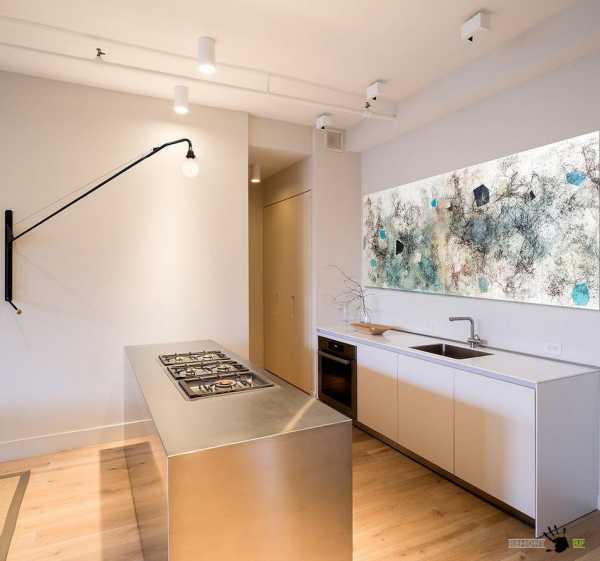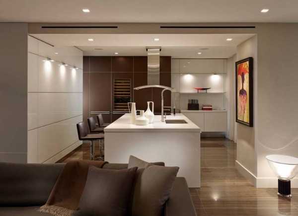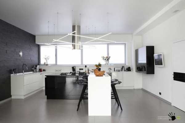 - На потолке. Одна лампа подходит для классических стилей, а вот отдельные светильники для каждой зоны — для современных. Учитывайте, что первое решение дает мягкий, рассеянный, не слишком яркий свет, оставляющий тени, а вот при втором гораздо удобнее работать.