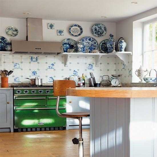 Лучше всего удастся реализовать этот стиль в кухне. Здесь есть много поверхностей, которые можно покрыть керамикой, – стены, пол. Кроме того, характерная гжельская посуда именно здесь будет самой уместной и гармоничной.