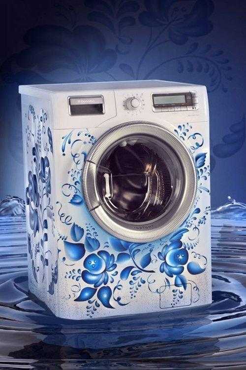 Белоснежная бытовая техника, безусловно, будет гармонировать с гжелью. В настоящее время можно воспользоваться возможностью изготовления бытовой техники и сантехники на заказ, то есть любого цвета и даже с необходимой росписью.