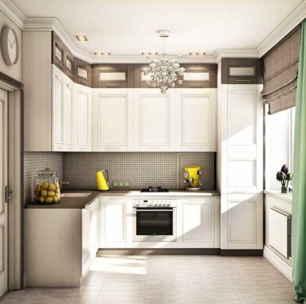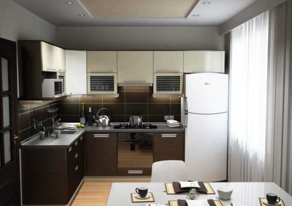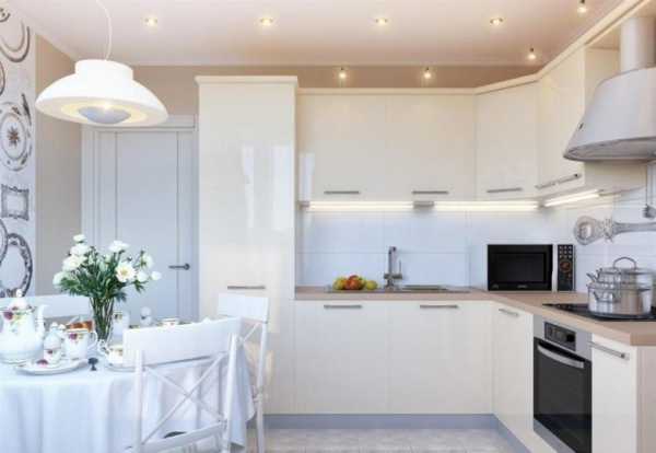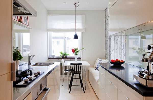 удобно около стены, имеющей укороченный ряд. При маленьких площадях можно вовсе отказаться от обеденного стола. Для этого рекомендуется установить узкую барную стойку. Оригинально смотрится сочетание подоконника с откидной столешницей. Широкий проход позволяет установить обеденную зону в центре кухни. Стулья лучше выбирать компактных размеров. Двери в шкафах должны открываться с помощью раздвижной системы. Более удобен легкий стол, при необходимости его можно быстро передвинуть. - Цветовое решение интерьера кухни. Добавить простора помогает белый цвет. В этот колер следует окрасить стены и потолок. Светлые фасады мебели зрительно увеличат пространство. Желательно, чтобы в интерьере было много стекла и глянцевых покрытий. Умелое расположение зеркал поможет визуально расширить размеры помещения. Если белому тону хозяева предпочитают другой, тогда выбирают цветовую гамму со светлыми оттенками. Наиболее выгодный вариант – стены и фасады мебельного гарнитура должны быть оформлены в одном светлом тоне.