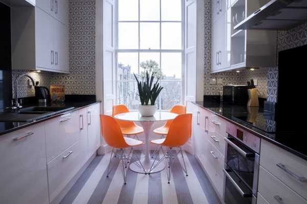 Два наиболее популярных варианта размещения обеденной зоны для кухни с параллельной планировкой это либо установка стола в середине, либо – сбоку, вдоль одной из стен.