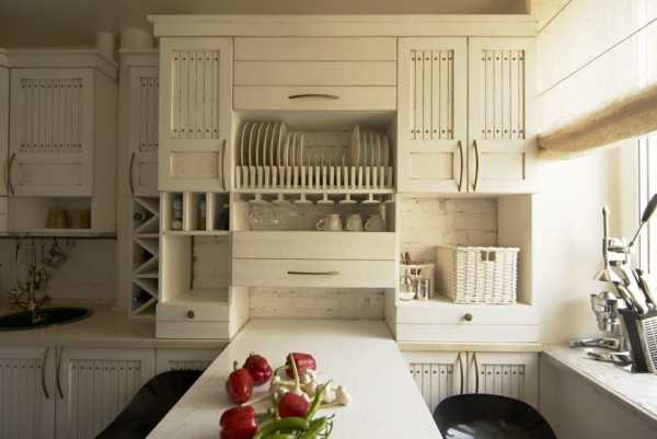 Если на кухне обустроено достаточно мест для хранения посуды, продуктов, утвари и т.д., тогда можно несколько массивных навесных шкафов заменить на легкие открытые полки. Они помогут сделать кухню более просторной и не такой тесной.