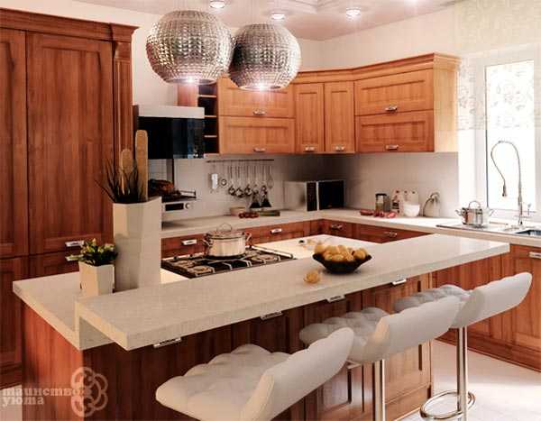 Этот вариант оформления кухни больше всего подойдет для квартиры студии, ведь в этом случае все гости и хозяева квартиры находятся в одном помещении, что удобно для общения. На самой барной стойке можно расставить тарелки, напитки, организовав, что-то в виде «шведского стола».