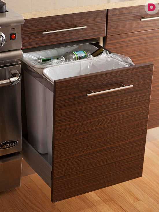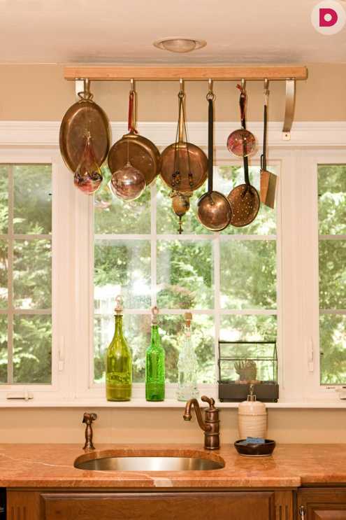 Чтобы сохранить чистоту на кухне, избежать неприятного запаха и необходимости трогать мусорное ведро руками, его можно спрятать в выдвижной шкаф под раковиной, предварительно вложив в него пакет.21. Подвесная утварь