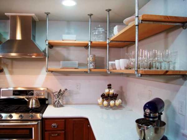 Угловые. Размещение открытых полок в углах является наиболее выигрышным вариантом для распределения полезной площади кухни. Углы комнат обычно пустуют, и мы не обращаем на них особого внимания. Такое расположение максимально придаст вам свободу действий, а полки станут практически незаметны, и не скрадут кухонное пространство.