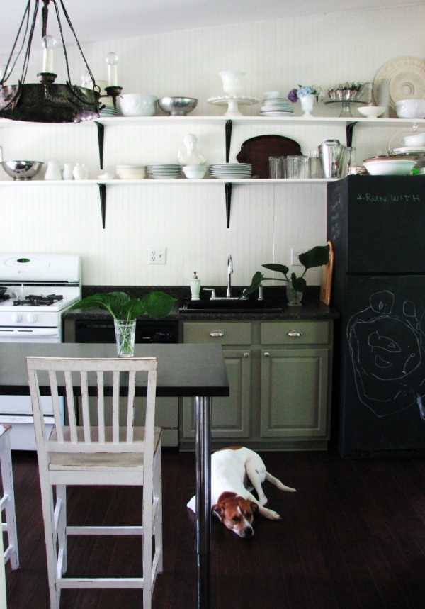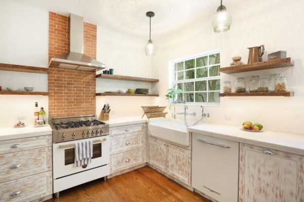 Деревенским направлениям (кантри, прованс) свойственно наличие полок вместо верхнего яруса мебели. На открытой поверхности прекрасно разместятся всевозможные декоративные мелочи.