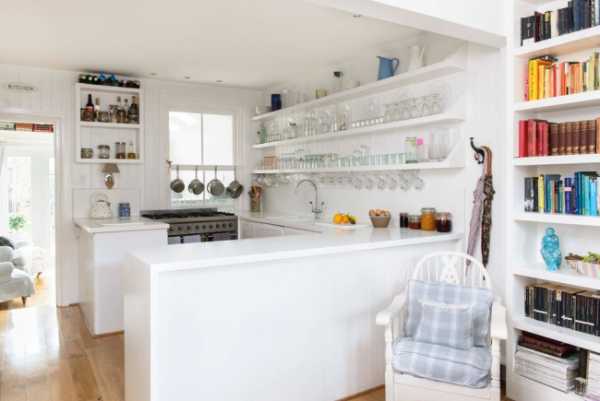 Открытые полки вместо навесных верхних шкафов – это всегда больше времени на уборку пыли