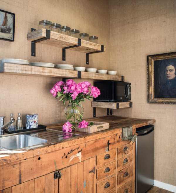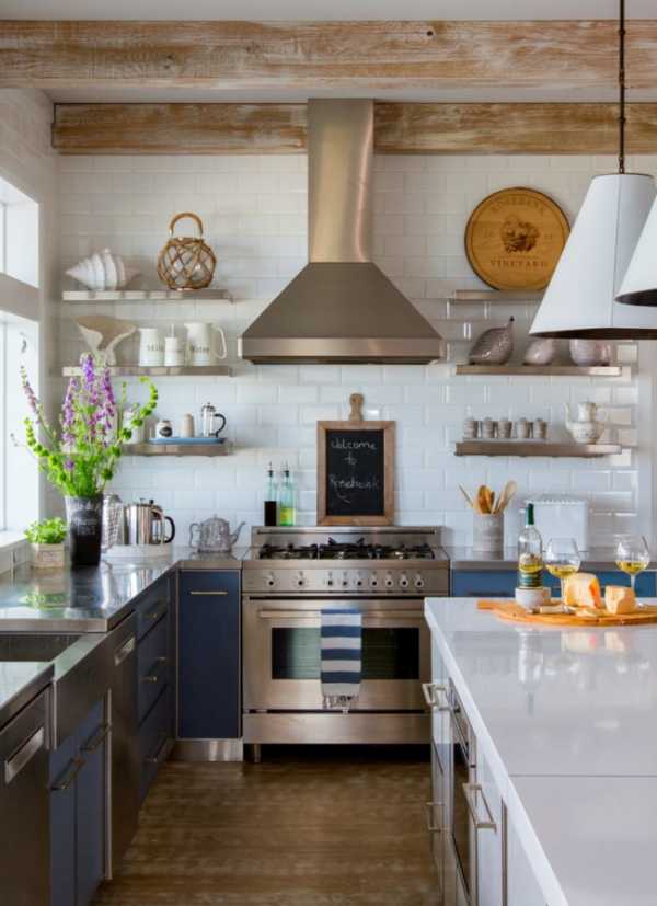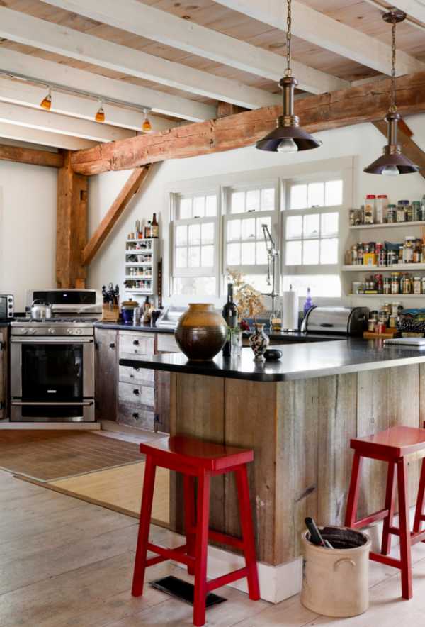 Кухня в стиле кантри с деревянными балками и небольшими полками вместо громоздких шкафов