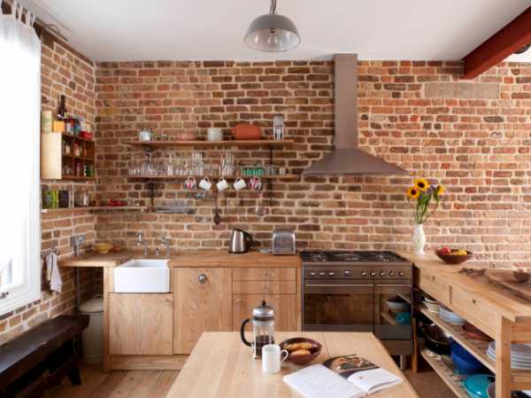 Небольшая кухня с кирпичными стенами без верхних шкафов