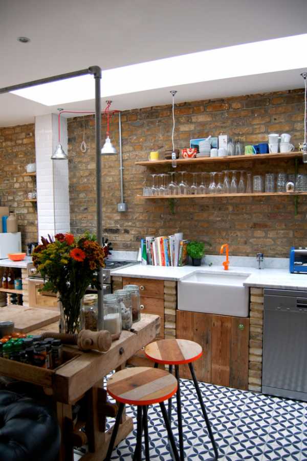 Эклектичная кухня без закрытых больших шкафов – экономный вариант