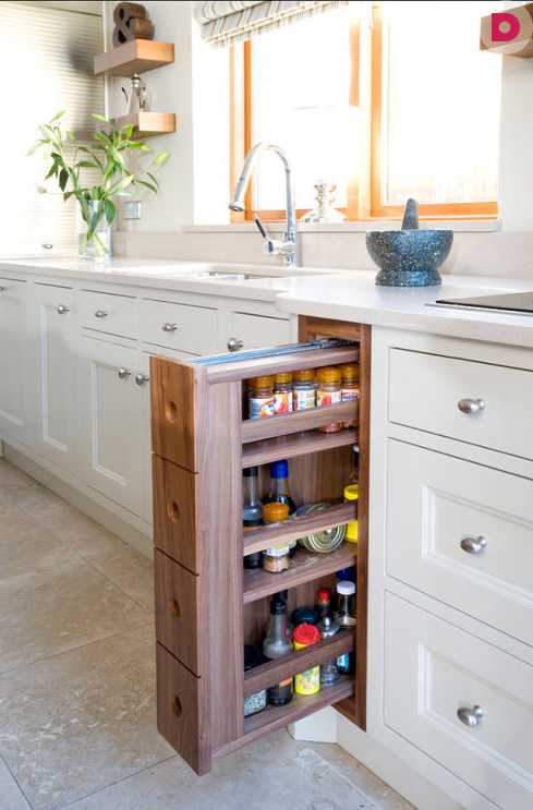 В шкафах с дверцами можно создать дополнительные места для хранения, увеличив их площадь за счет специальных креплений и трансформируемых полок. С ними вы сможете использовать кухонную мебель по максимуму!8. Выдвижные полки