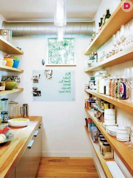 Оптимальный вариант – обустройство кладовой, которая одновременно будет хранилищем кастрюль, сковородок, банок и продуктовых запасов. Кладовку можно оборудовать в одном из углов или в нише, если таковая имеется.