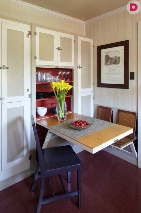 Солидной экономии пространства можно достигнув, организовав на кухне удобный многофункциональный уголок, который будет служить и рабочей поверхностью, и обеденным столом, и местом для хранения кухонных принадлежностей.15. Обеденный уголок