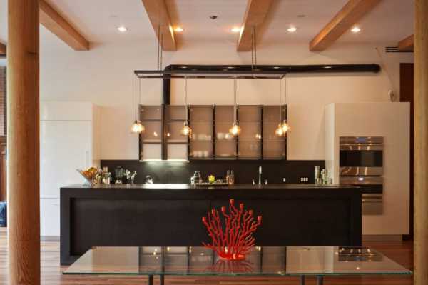 Один из явных плюсов лофта состоит в том, что инженерные системы не нужно прятать или маскировать. Кухня может быть наполнена такими элементами — деревянные балки на потолке, трубы, стропила и опорные столбы. Над кухонной плитой может располагаться большая хромированная вытяжка. Фартук кухни можно оставить в виде кирпичной кладки, не используя здесь отделочные материалы.
