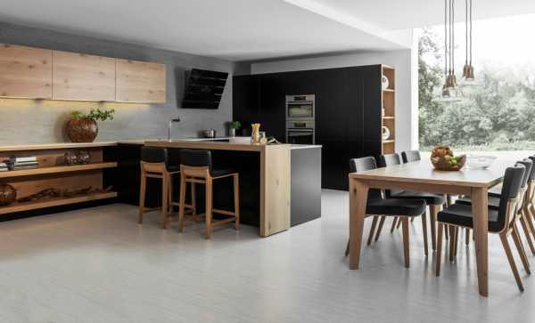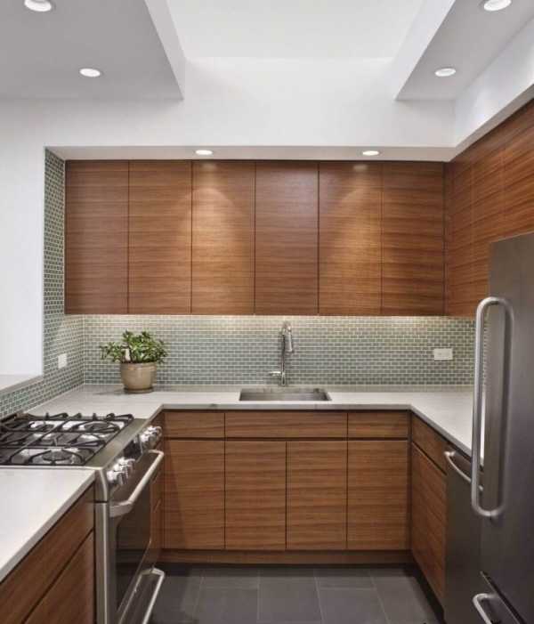 Обыграйте разные текстуры, используя большое количество светоотражающих поверхностей. Это придаст кухне простор. Используйте натуральное дерево в тех местах, где будет соприкосновение с руками, чтобы обеспечить тактильный комфорт.