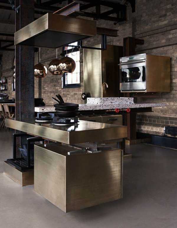 Нержавеющая сталь улучшает концепцию и подчеркивает контраст между гладкой металлической поверхностью и текстурированными стенами, поэтому многие кухни оснащены коммерческой или профессиональной техникой.