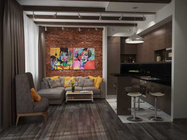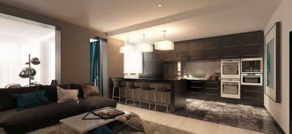 Если кухня соединена с гостиной, комнаты можно разделить на зоны посредством мебели, комбинирования напольных покрытий и света.