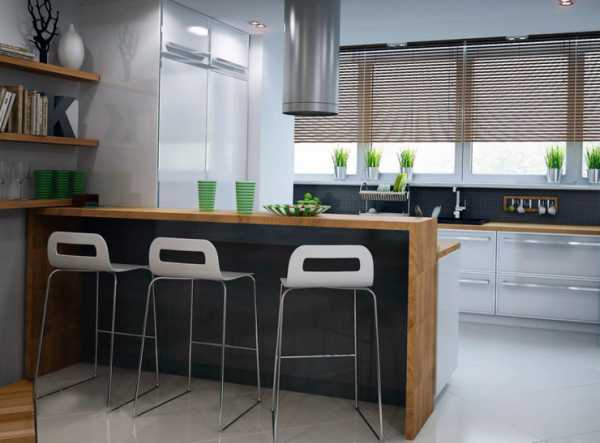 Никаких ширм, перегородок и арок. Барная стойка может поделить помещение зрительно и функционально. Отделит кухонный остров, иногда послужит обеденным столом.