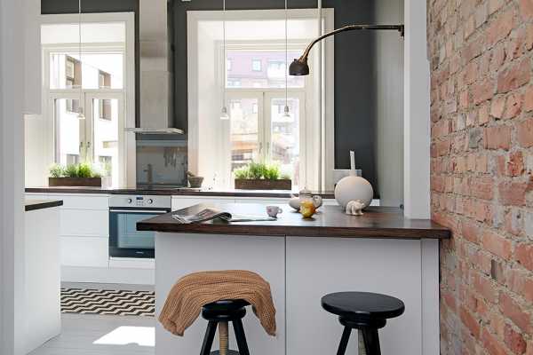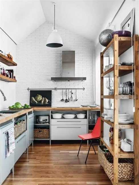 Хорошее решение — побеленная кирпичная кладка с акцентом — кухонным фартуком контрастного цвета.