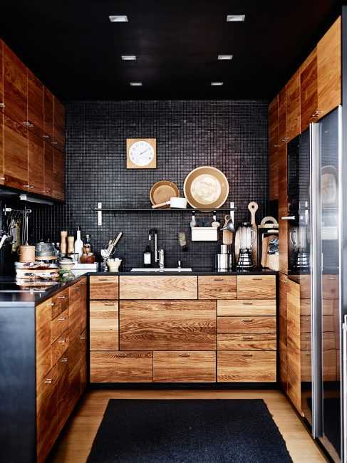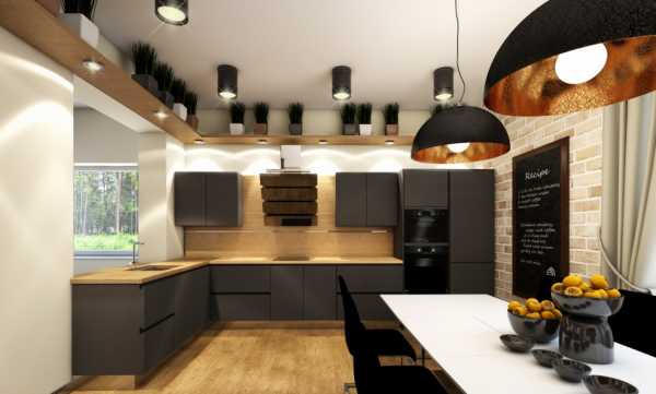 Стиль лофт более подходит для просторных кухонь с высокими потолками. Но даже типовому помещению можно придать черты индустриального стиля. Кроме этого, благодаря обильному освещению пространство кухни можно несколько расширить.