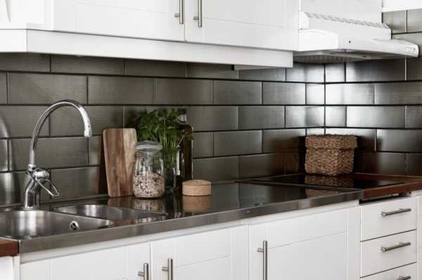 Также дизайнеры рекомендуют рабочую стену закрыть стальными панелями, закаленным стеклом или керамической плиткой имитирующей металл, древесину или бетон.