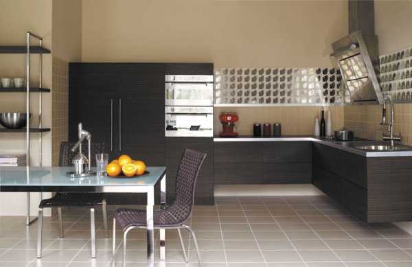 Кухонная техника предпочтительна встроенного типа, а вот вытяжка не должна прятаться. Фасад мебели должен сочетаться с дверцами техники.