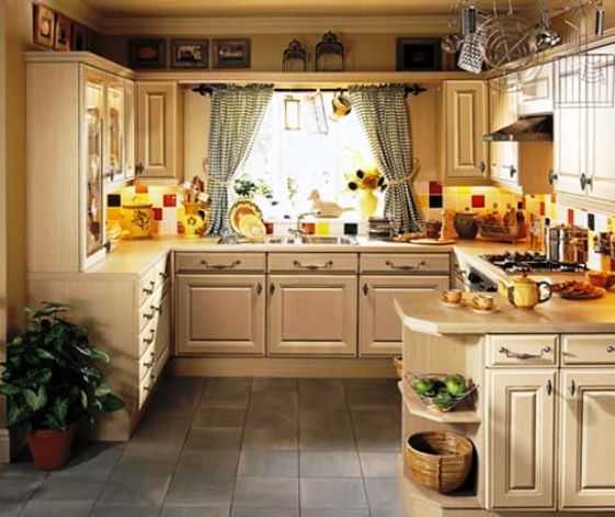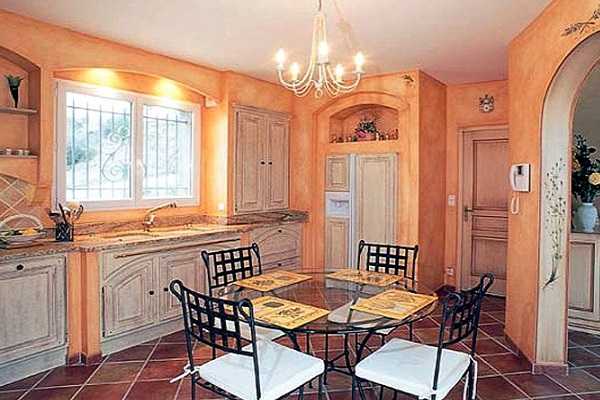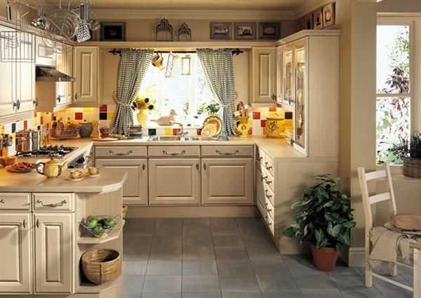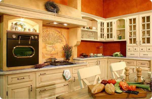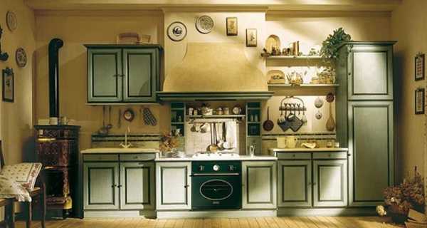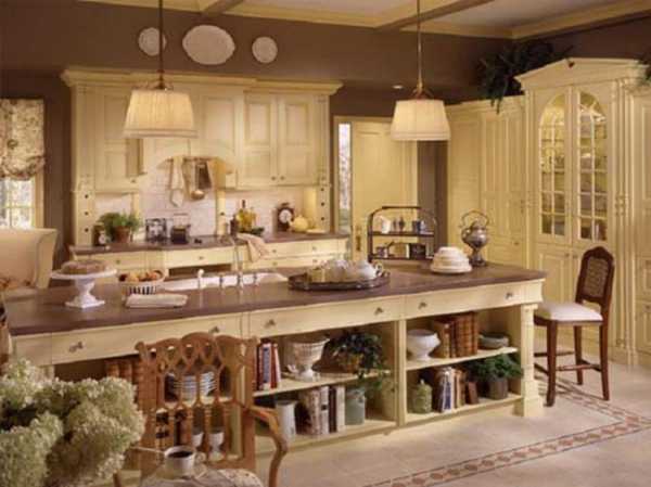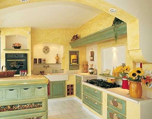 Главной особенностью, визитной карточкой, отличительной чертой этой кухни является ее теплая цветовая гамма. Она обязательно должна быть насыщенного пастельного цвета. Но возможна отделка кухни голубым или нежно-зеленым цветами или оттенками желтого, красного.