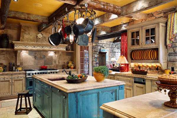Неизменными актуальными аксессуарами такой кухни остаются медные или латунные кованые полки, глиняные расписные горшки, вазы, связанные вручную салфетки, сплетенные из лозы корзины, изящные настенные механические часы, мешочки с высушенной лавандой, мятой, розмарином, с другими душистыми травами.