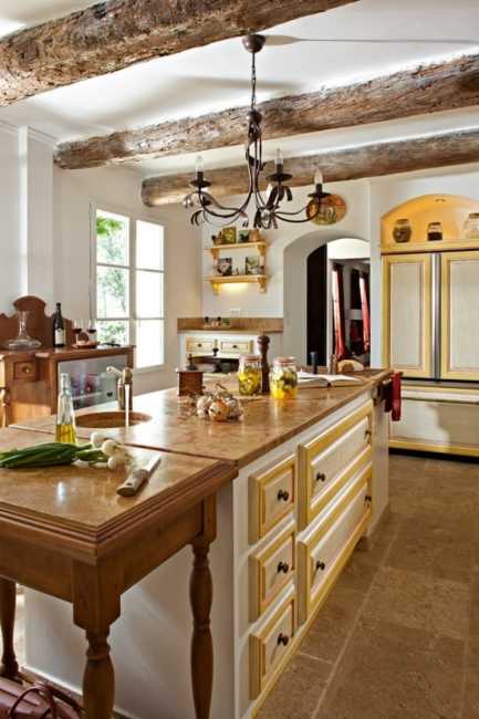 Стиль прованс предполагает применение натуральных, экологически чистых материалов, особенно это касается отделки стен и полов. Идеалом для настоящей французской кухни служит каменный пол, стены с грубой штукатуркой, потолок, имеющий деревянные балки. Но этот вариант более характерен для частного дома, сделать такое в городской стандартной квартире очень трудно. Поэтому дизайнеры на кухне часто делают имитацию навесных потолков. Хотя потолок можно оставить самым обычным – белым.