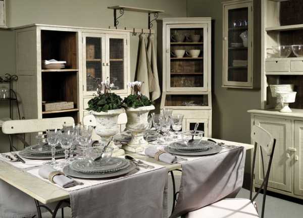 - Массивность, основательность и некая грубоватость – вот характерная черта мебели в стиле прованс. Большие пузатые буфеты со множеством ящичков и посудные шкафы, лавки и скамейки, тяжёлые раздвижные обеденные столы – пусть это всё поселится на вашей кухне.