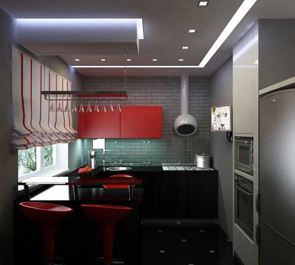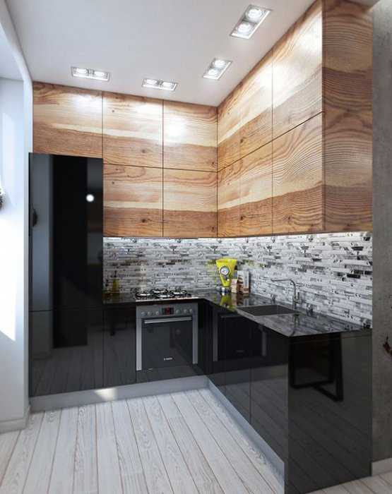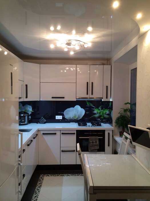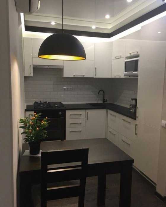 Для дизайна маленькой кухни в хрущевке в стиле лофт, эко или скандинавском подойдут и вот такие легкие и просты светильники.Глянцевая мебель и глянцевый потолок могут отлично гармонировать, если в кухне достаточно искусственного освещения, и свет распределен равномерно.