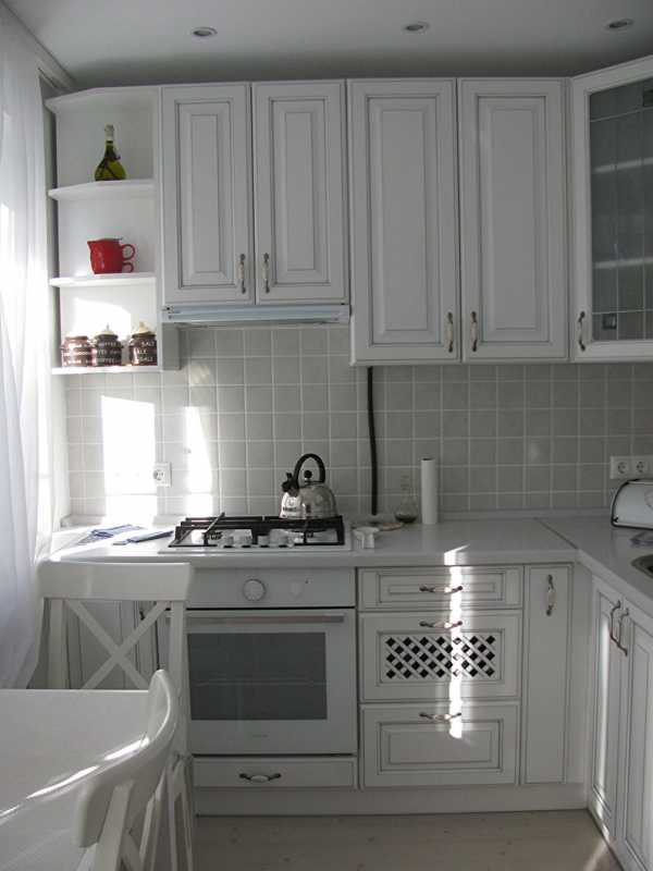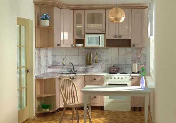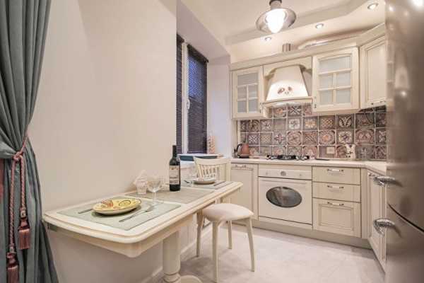 Роскошные традиционные стили с лепниной, объемным декором и массивной мебелью не подойдут. А вот современную классику вполне возможно воплотить на 5-7 кв.м. Выбирайте гарнитур с филенчатыми, рамочными фасадами, но компактный и в светлых тонах.